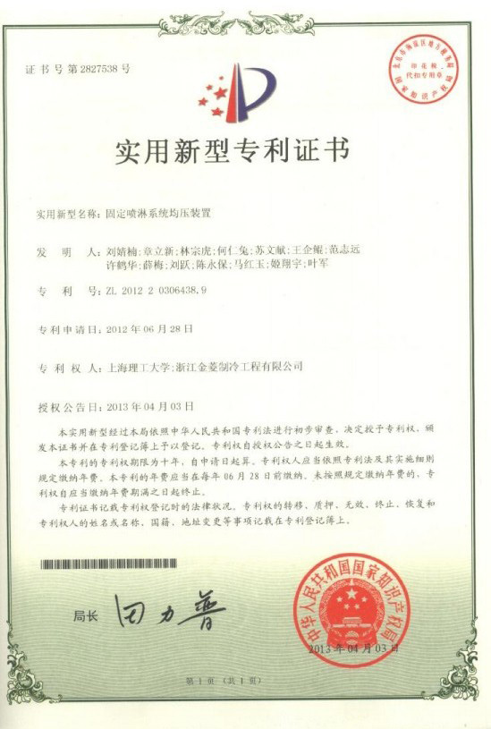 Patent certificate of Cooling system with small auxiliary for cooling tower